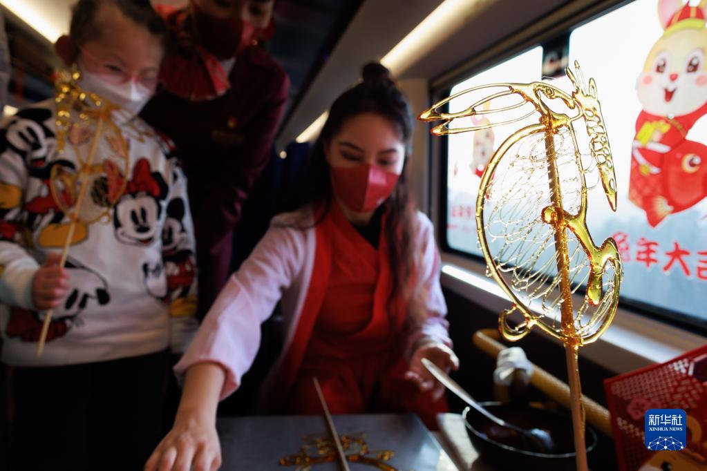 1月13日,工作人員在C5980次列車上為小朋友畫糖畫。