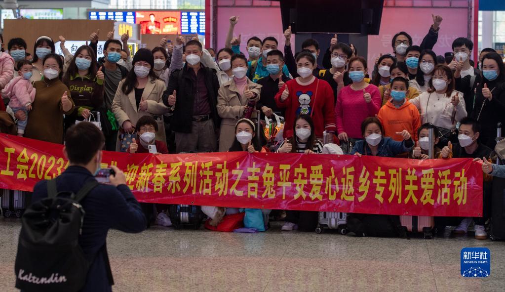 當日,G1008次愛心專列搭載著500多名長期在深圳工作的文明實踐志愿者從深圳北站駛往武漢。G1008次列車是深圳鐵路部門今年春運開出的第6趟愛心專列,暖心助力深圳地區的文明實踐志愿者和城市奮斗者及家人順利回家過年。新華社記者 毛思倩 攝