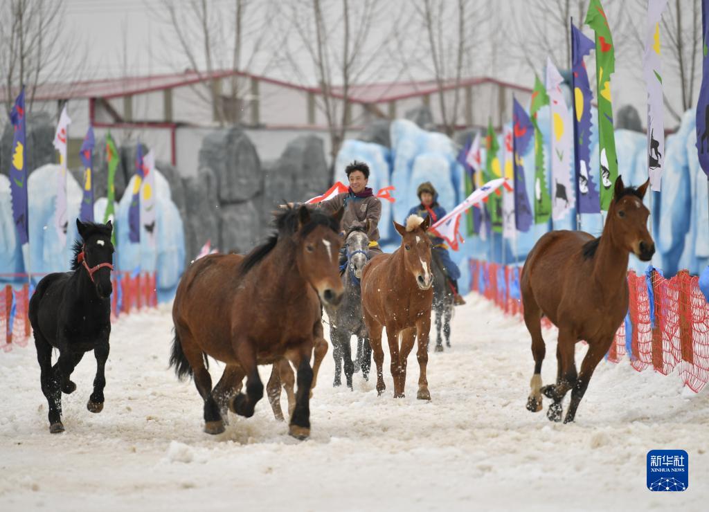 1月13日,演員在冰雪嘉年華現場表演馬術。