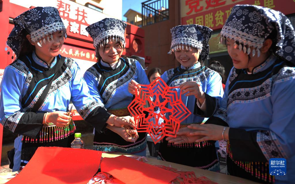 春節臨近,在貴州省黔南布依族苗族自治州羅甸縣木引鎮康夢家園,搬遷群眾剪窗花、打糍粑、掛燈籠、貼春聯,一派喜迎農歷新年到來的繁忙景象。