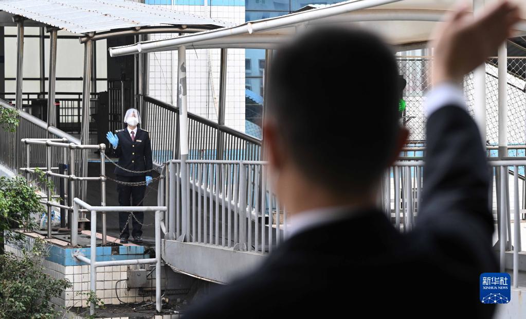 在廣東徐聞的粵海鐵路輪渡北港碼頭的人行棧橋上,肖玉鳳(左)跟船上的丈夫李雄揮手告別(1月9日攝)。