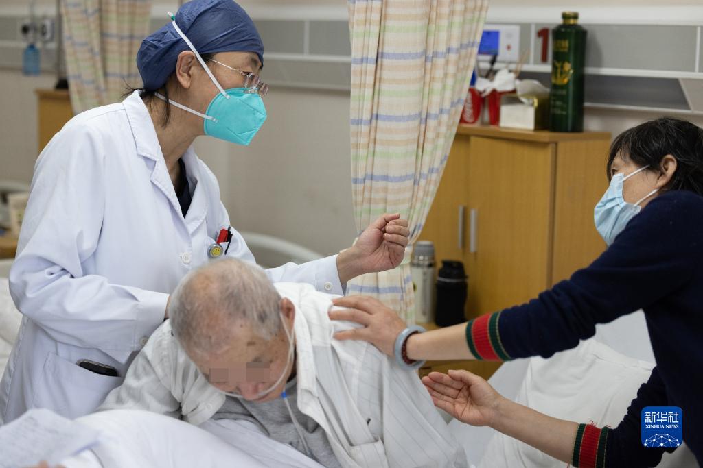1月12日,在復旦大學附屬華山醫院虹橋院區,感染科主任醫師李寧指導家屬給患者拍背幫助排痰。