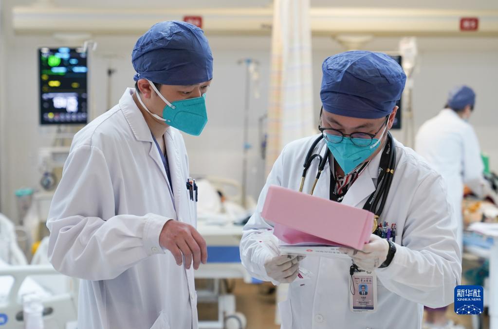1月7日,在復旦大學附屬華山醫院虹橋院區急診搶救室,醫生劉逸奇(右)和同事討論患者病情。