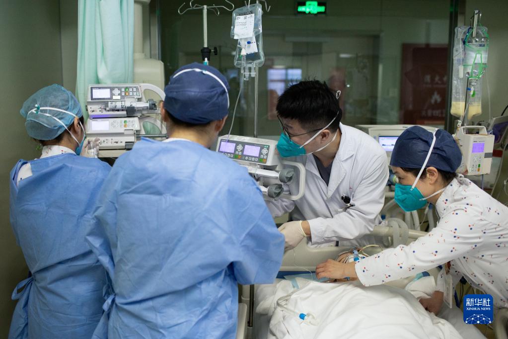 1月12日,在復旦大學附屬華山醫院虹橋院區收治肺炎患者的重癥監護室,醫護人員給患者換俯臥位。