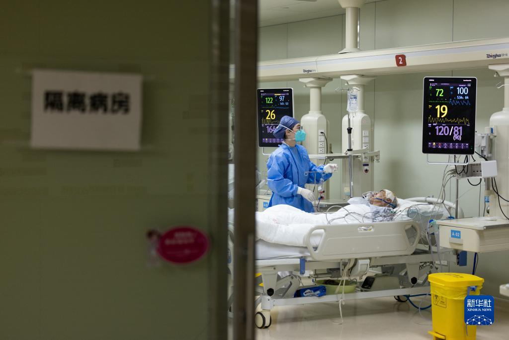 1月12日,在復旦大學附屬華山醫院虹橋院區收治肺炎患者的重癥監護室,護士查看患者輸液情況。