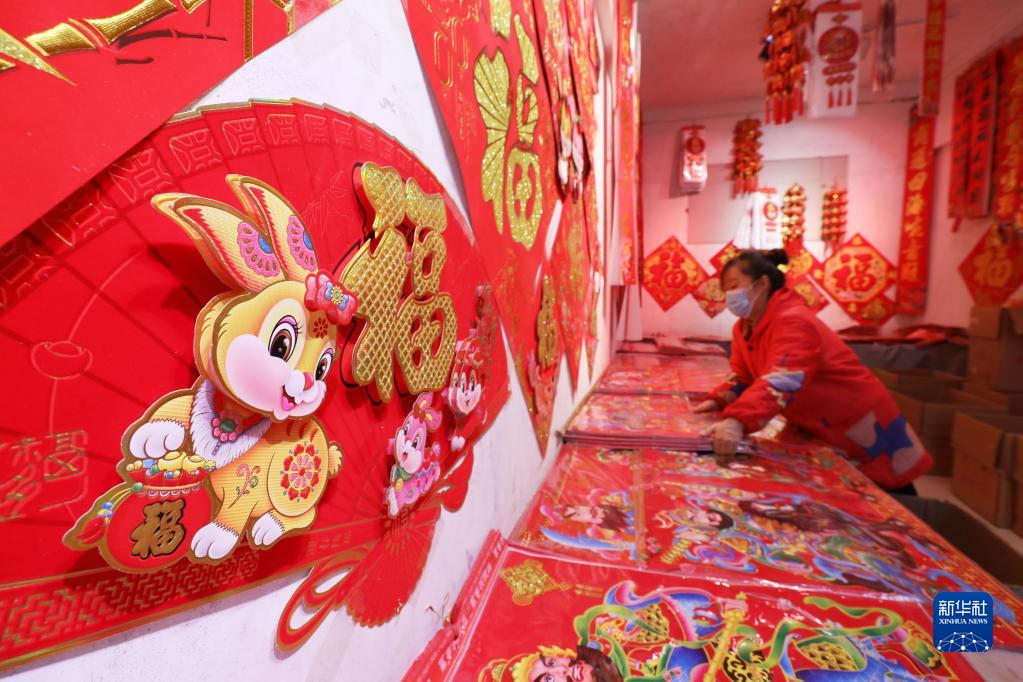 1月13日,在河南省焦作市溫縣趙堡鎮趙堡村年貨市場,商戶在整理春聯、福字等飾品。