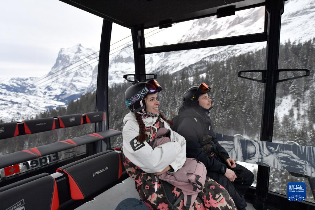 1月12日,在瑞士少女峰,滑雪好者乘坐纜車上山。