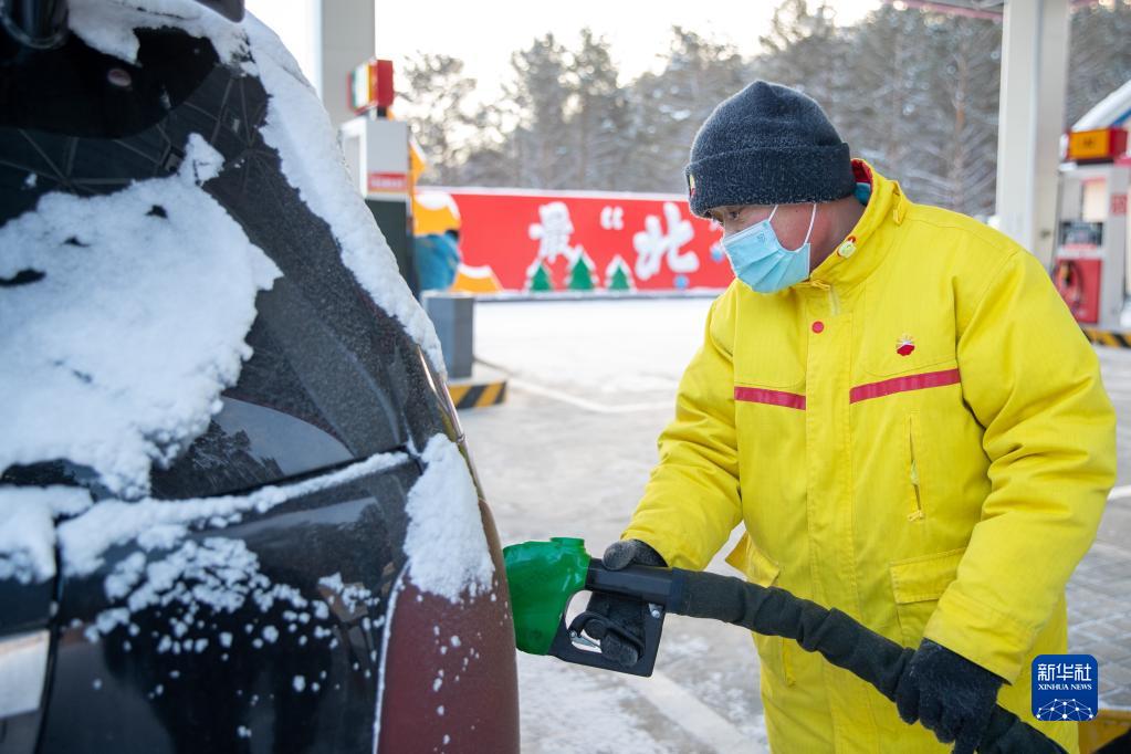 1月13日,在北極村加油站內,工作人員沙德輝在給汽車加油。