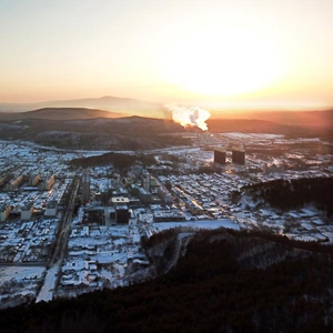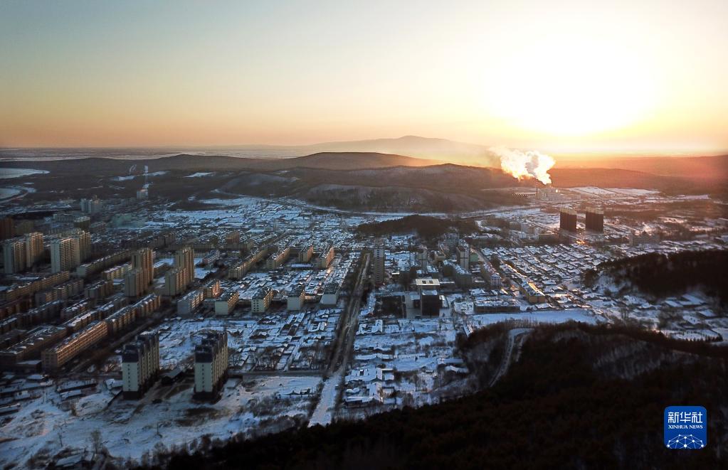 1月14日,晨光照耀著黑龍江省撫遠市城區(無人機照片)。