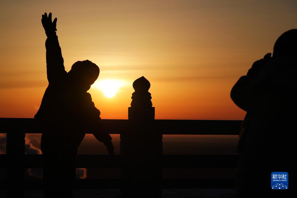 1月14日,游客在黑龍江省撫遠市東極閣觀賞日出拍照留念。