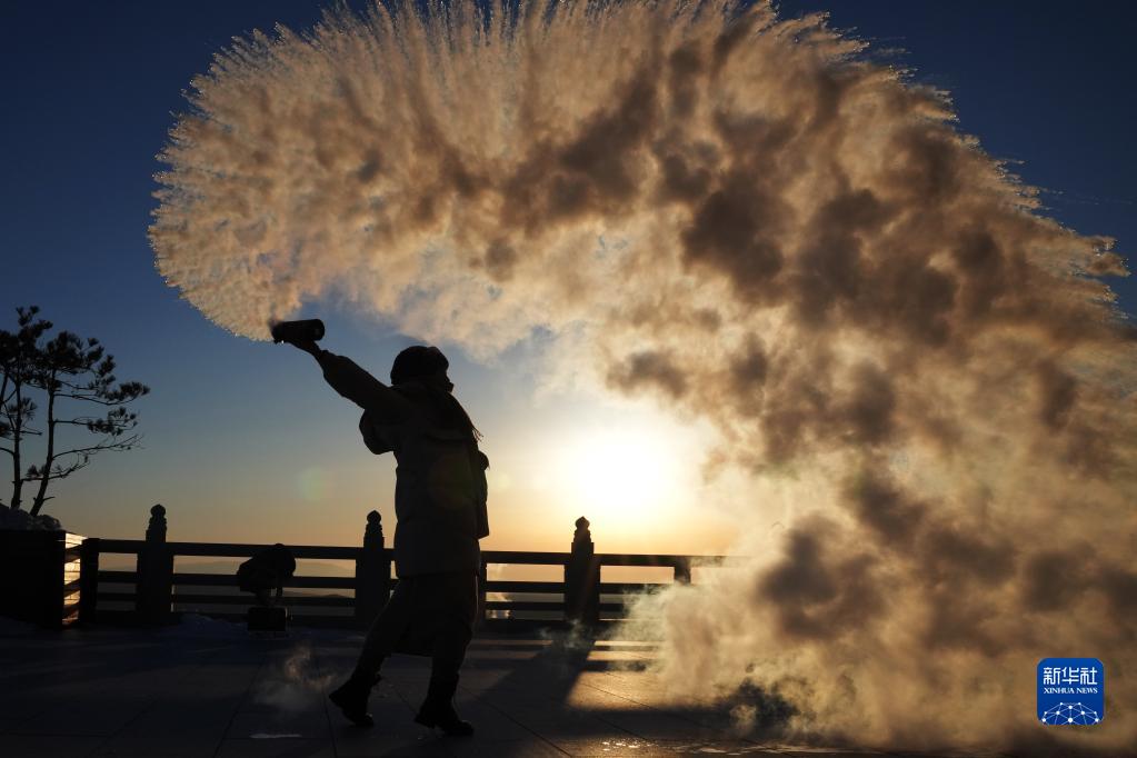 1月14日,在黑龍江省撫遠市東極閣,游客在日出時玩“潑水成煙”。