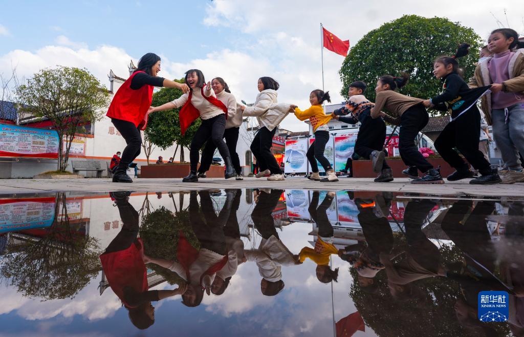 1月13日,江西省新余市渝水區珠珊鎮花田村畫溪書院,孩子們在志愿者組織下參與趣味游戲。