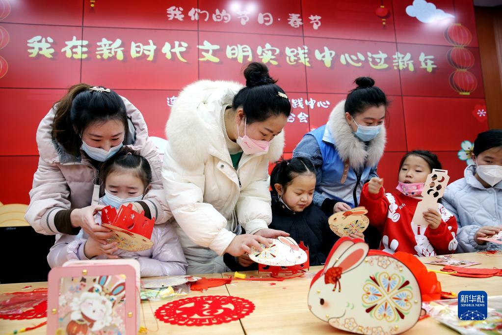 1月13日,在江蘇省連云港市開展的“我在新時代文明實踐中心過新年”活動中,孩子們在學習拼裝兔子花燈。