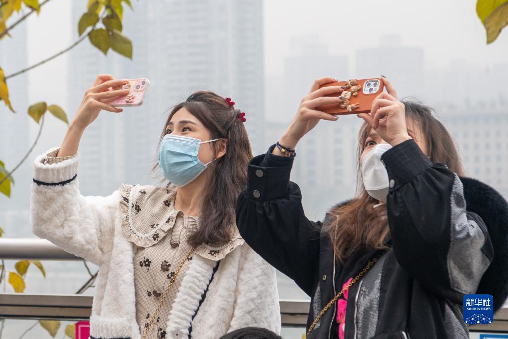 1月13日,在位于重慶市渝中區的軌道交通李子壩站附近,游客在拍攝“穿樓而過”的列車。