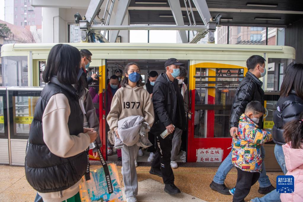 1月13日,在位于重慶市渝中區的長江索道站點,搭乘長江索道過江的游客抵達后走出轎廂。