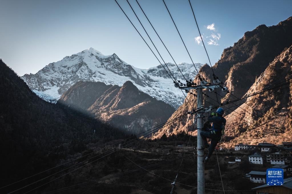 1月9日,旺登在雨崩村檢修電路(無人機照片)。