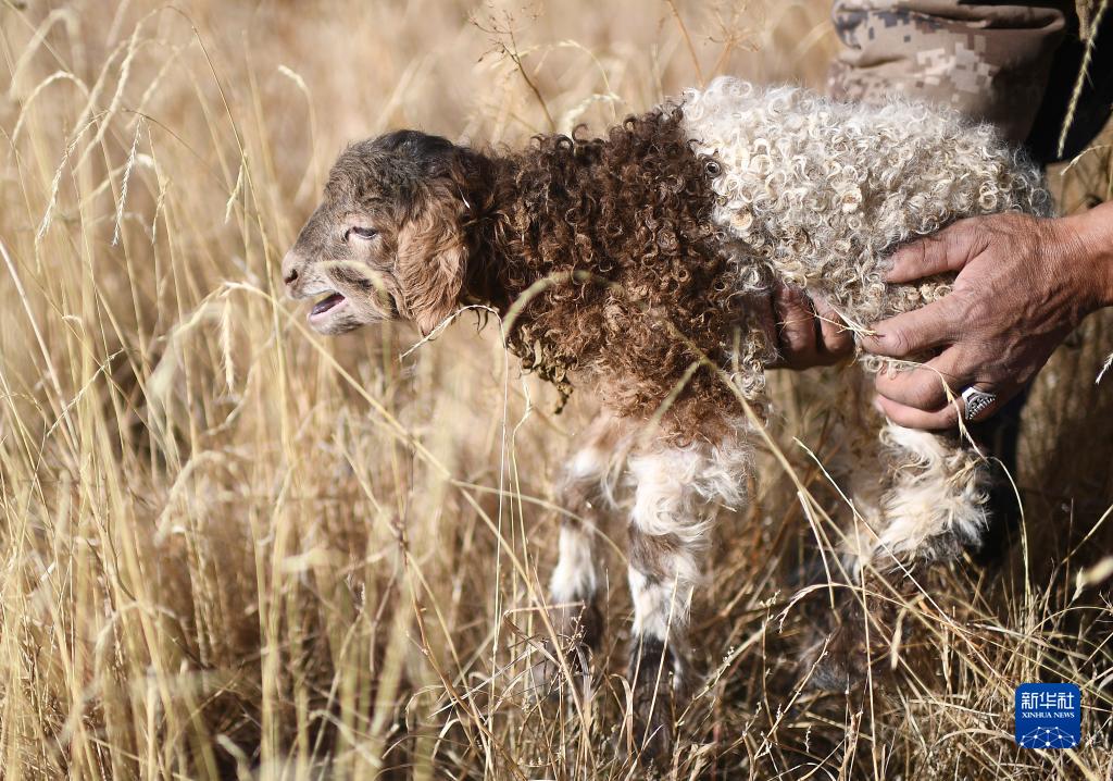 1月12日,在青海省海北藏族自治州剛察縣伊克烏蘭鄉剛察貢麻村,牧民吉科加為小羊羔清理羊毛后放入冬季草場。