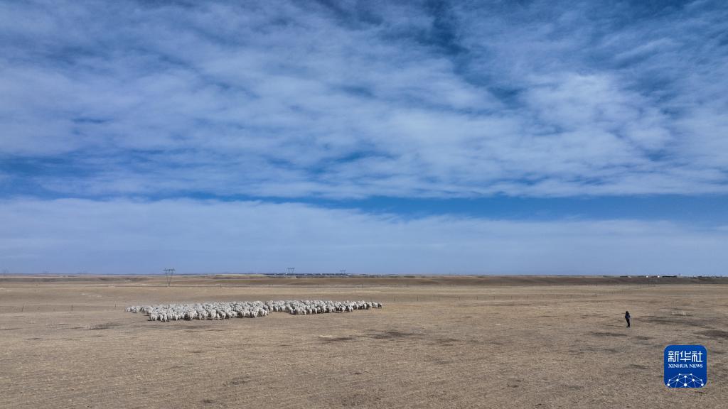 1月12日,牧民在青海省海北藏族自治州剛察縣泉吉鄉放牧(無人機照片)。
