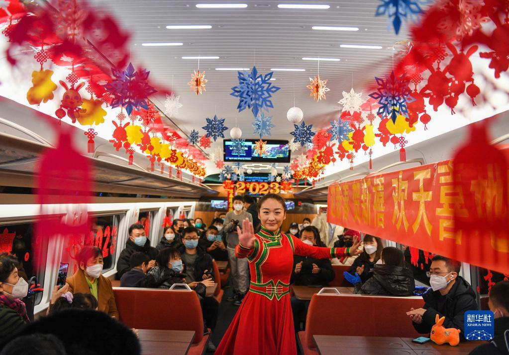 當日正值北方小年,北京開往呼和浩特的G2457次復興號列車被乘務員們布置得喜氣洋洋。高鐵乘務員和鐵路烏蘭牧騎隊員們,不僅為旅客奉上一臺精彩演出,還準備了豐富的節日禮品,一路歡聲笑語伴隨著乘客。