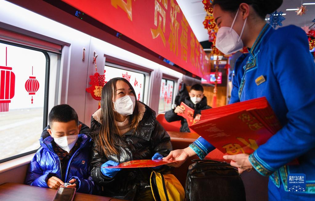 當日正值北方小年,北京開往呼和浩特的G2457次復興號列車被乘務員們布置得喜氣洋洋。高鐵乘務員和鐵路烏蘭牧騎隊員們,不僅為旅客奉上一臺精彩演出,還準備了豐富的節日禮品,一路歡聲笑語伴隨著乘客。