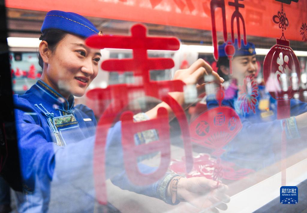 1月14日,G2457次復興號列車到達呼和浩特東站之后,乘務人員整理窗花,準備迎接下一批旅客。