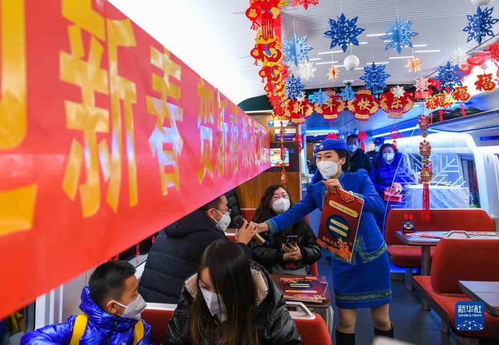 當日正值北方小年,北京開往呼和浩特的G2457次復興號列車被乘務員們布置得喜氣洋洋。高鐵乘務員和鐵路烏蘭牧騎隊員們,不僅為旅客奉上一臺精彩演出,還準備了豐富的節日禮品,一路歡聲笑語伴隨著乘客。