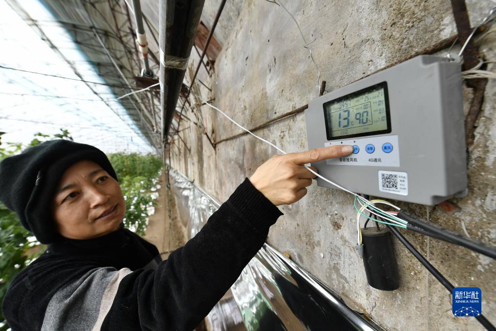 1月14日,唐山市豐潤區圪塔坨村農民查看大棚溫控設備。