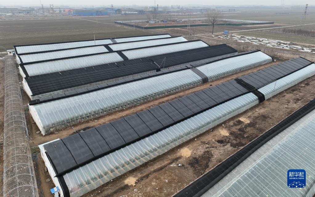 1月14日,唐山市豐潤區燕灃園生態農場果蔬大棚的保溫被根據氣溫變化進行調整(無人機照片)。