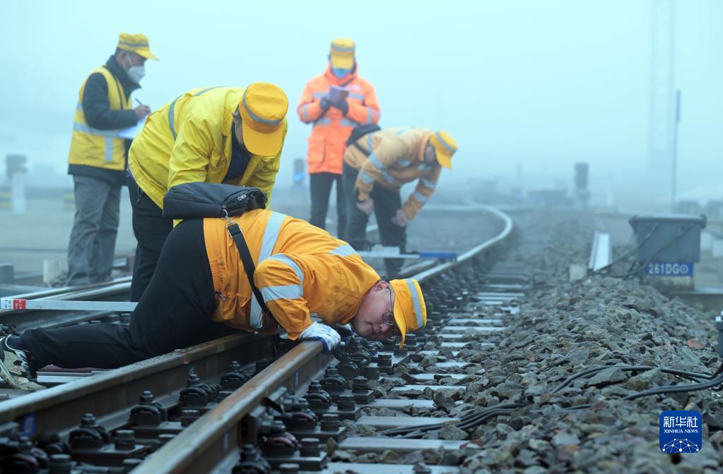 1月13日,中國鐵路上海局集團有限公司合肥工務段工作人員在合肥東站進行設備巡查作業。