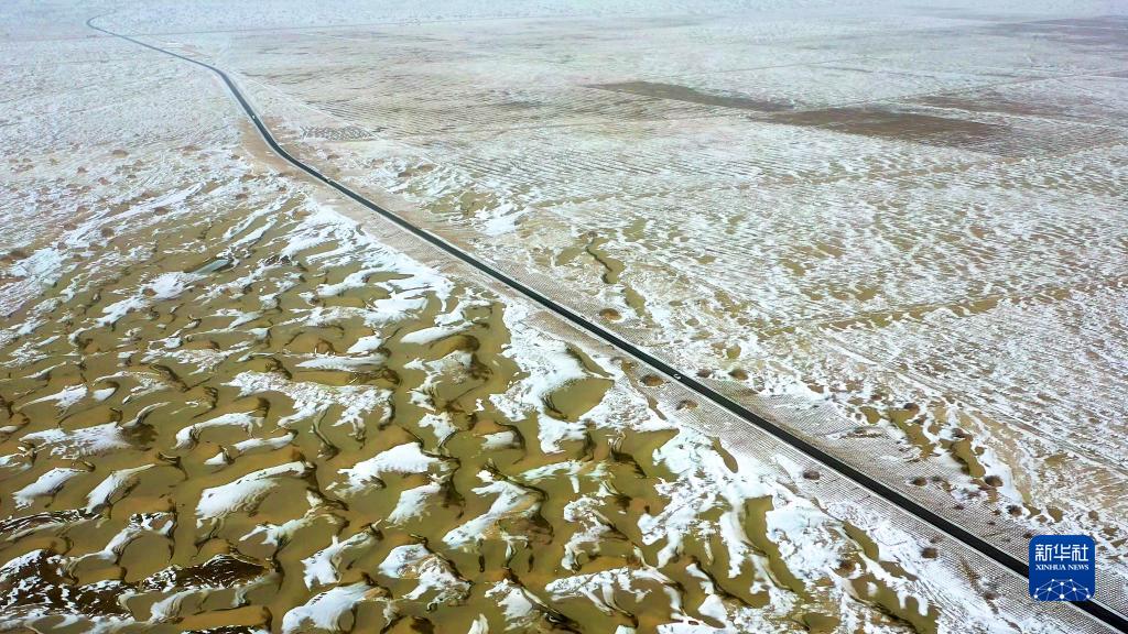 新疆阿克蘇地區沙雅縣以南的塔克拉瑪干沙漠迎來降雪(1月14日攝,無人機照片)。