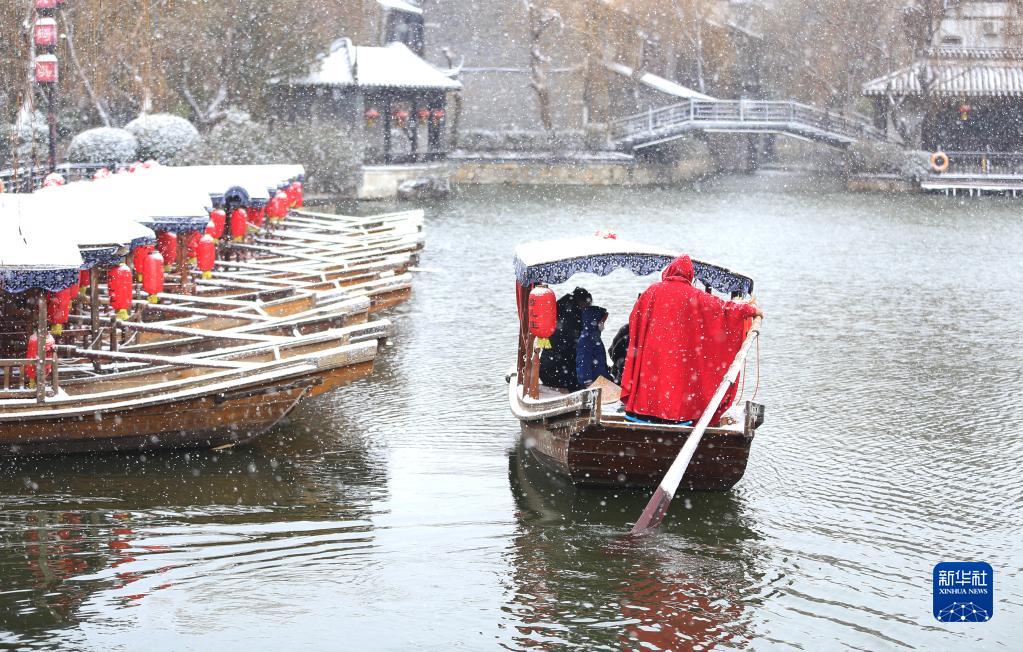 1月14日,在山東省棗莊市臺兒莊古城,游客乘船觀賞雪景。