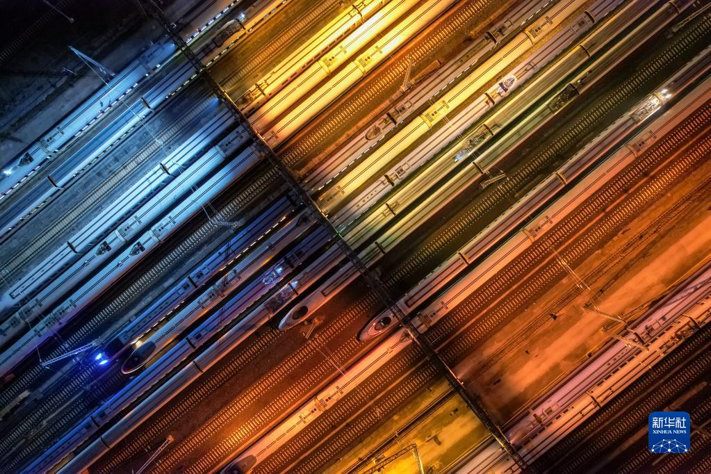 1月7日,2023年春運啟動。1月6日晚,在中國鐵路成都局集團有限公司貴陽北動車所,??吭诖孳嚲€上的動車排列整齊如同一支“陸地艦隊”。