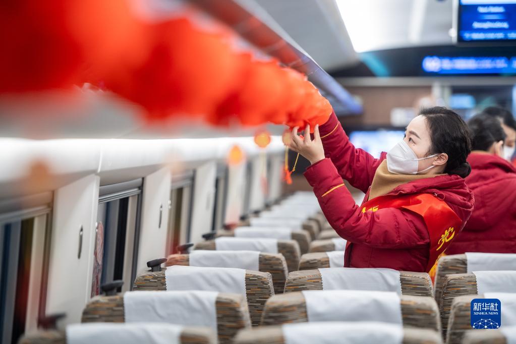 1月7日,在湖北武漢站,乘務員在列車上掛燈籠。
