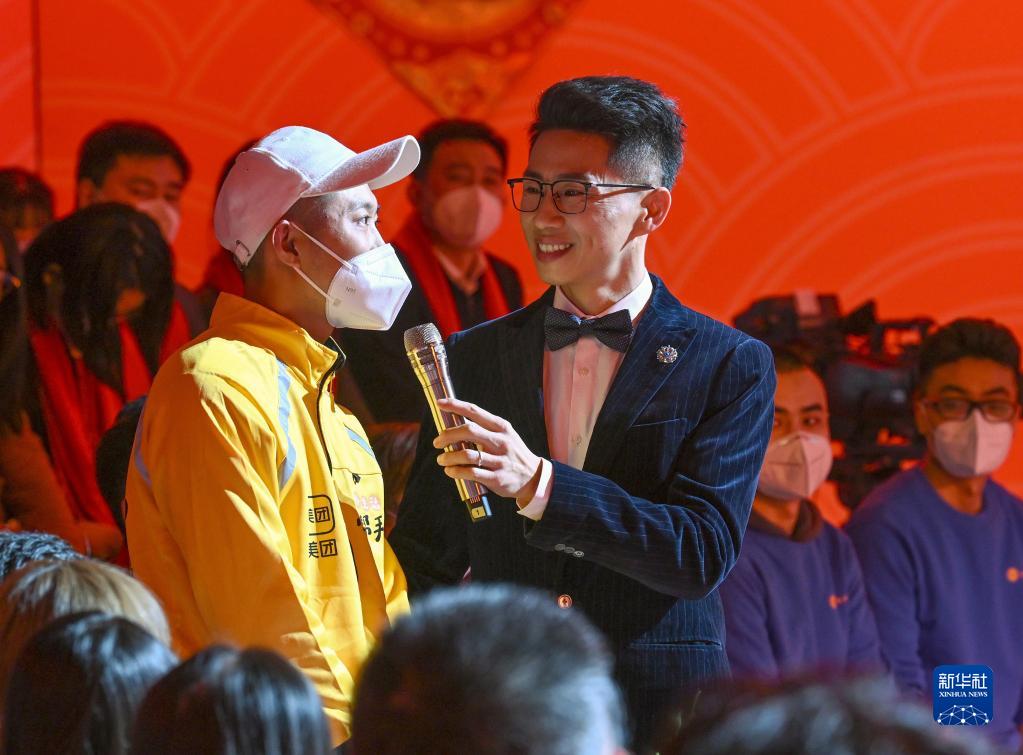 1月13日,見義勇為“00后”美團外賣騎手羅蟲董(左)受邀在新春聯誼會現場為觀眾送上祝福。