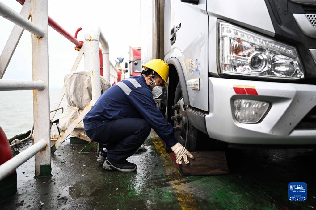 在粵海鐵路輪渡甲板,劉昱給停放的車輛安放車輪卡塊(1月8日攝)。
