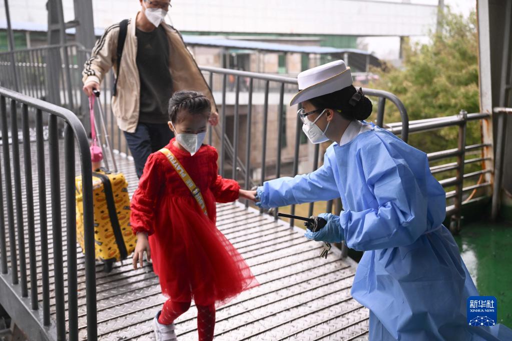 肖遙(右)幫助登上粵海鐵路輪渡的小朋友走下棧橋(1月8日攝)。