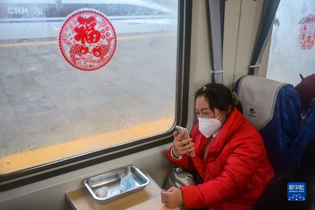 1月13日,在福州火車站,川籍務工人員在K1268次列車上和家人視頻。