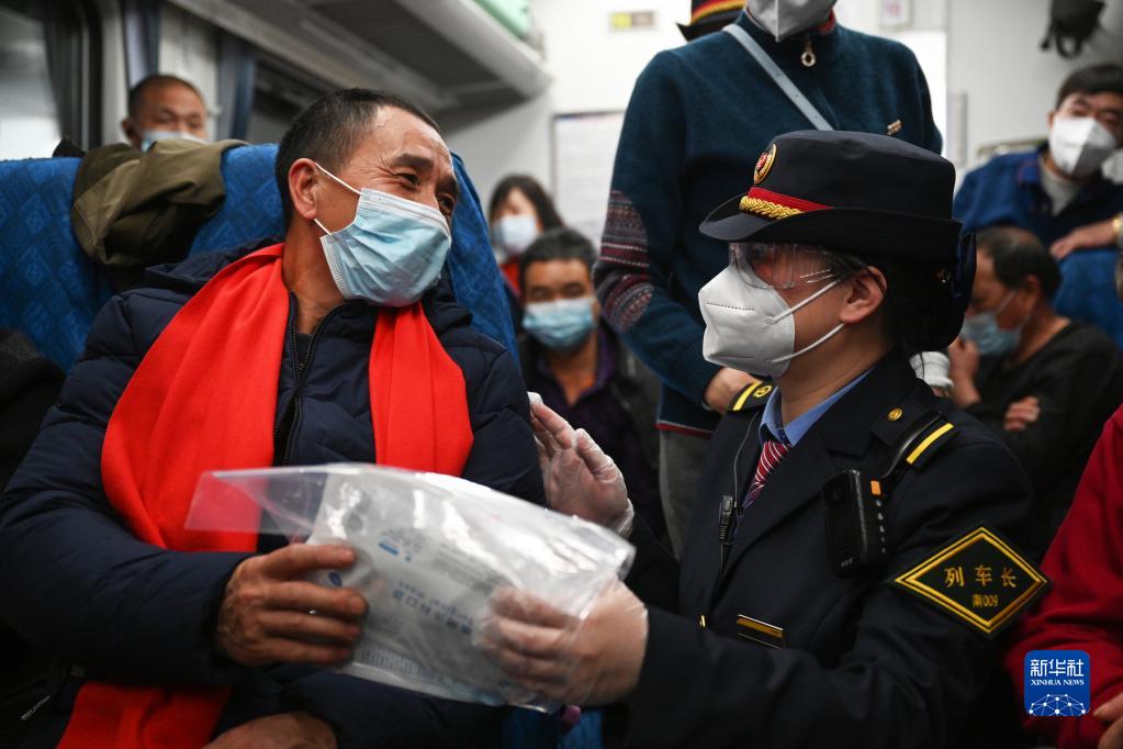 1月13日,乘務員在K1268次列車車廂里為乘客發放防疫健康包。