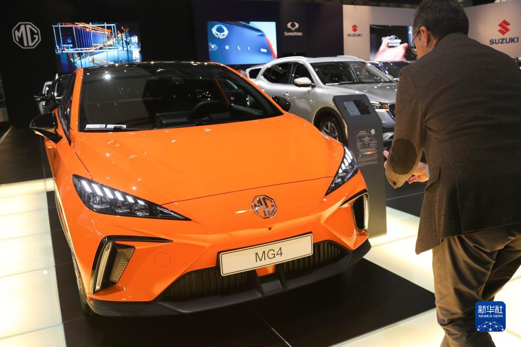1月13日,一名男子在比利時布魯塞爾車展媒體開放日上拍攝名爵4電動汽車。