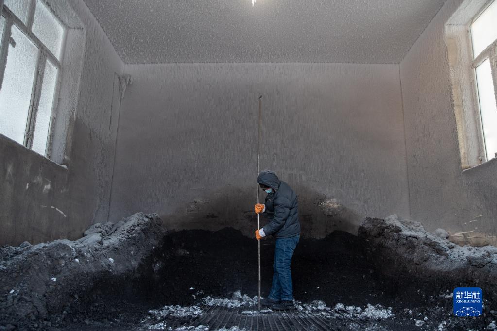 1月13日,工作人員在漠河華美供熱有限公司內進行上煤作業。
