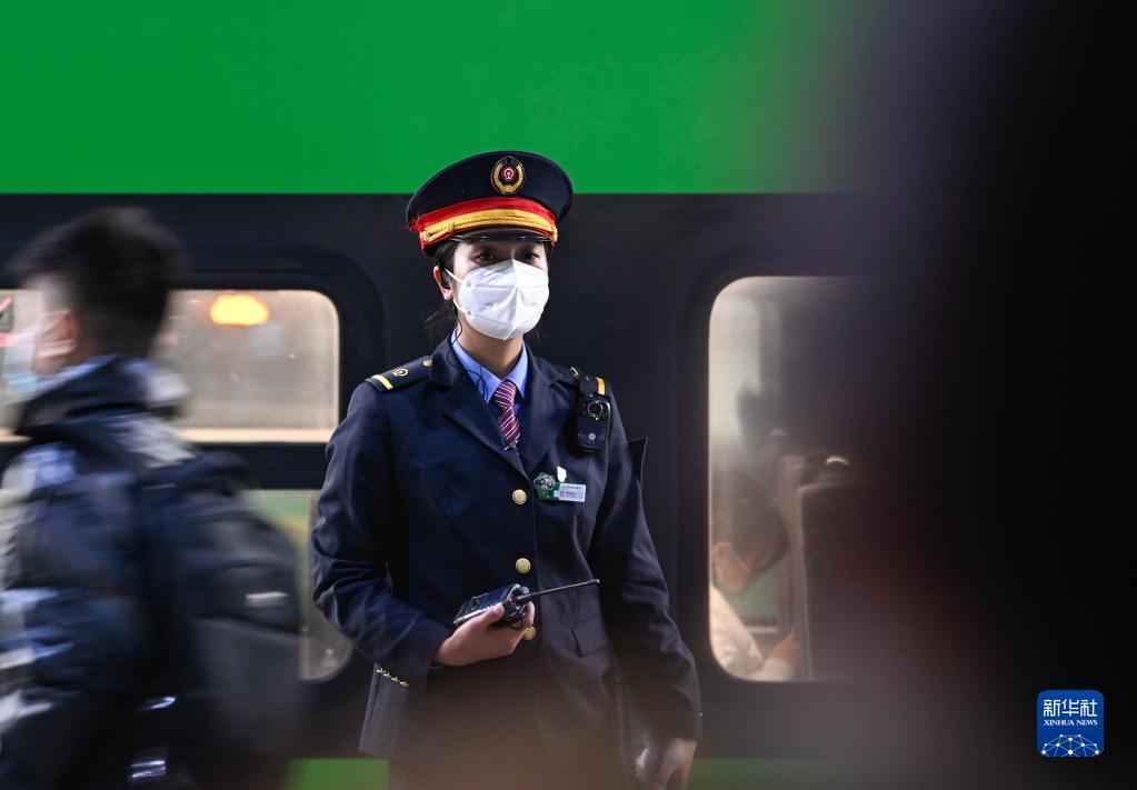 1月11日,在成都火車南站,阿依布卡在站臺上迎接旅客上車。