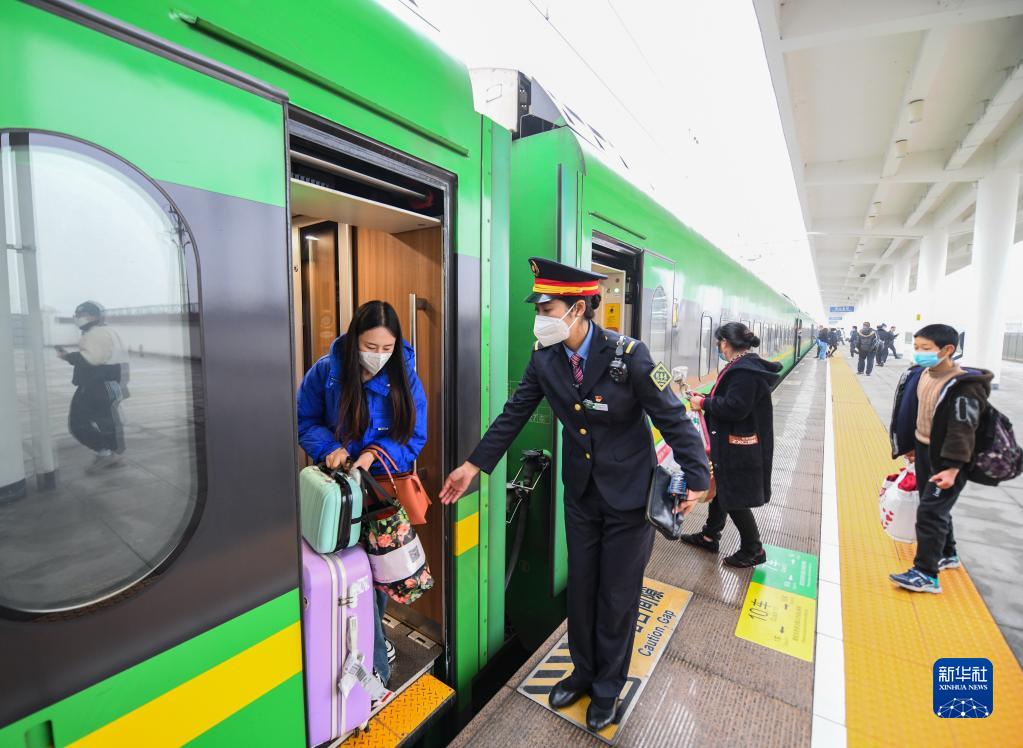 1月11日,在樂山北站,阿依布卡(左二)引導旅客下車。