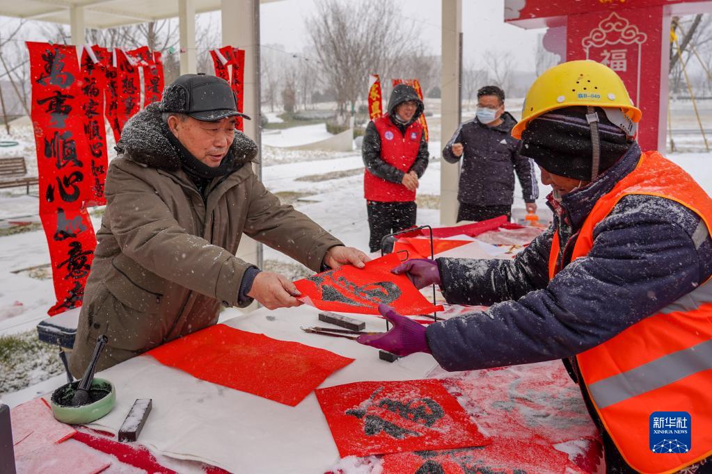 1月14日,書法愛好者在現場書寫春聯、福字,贈送給工友。