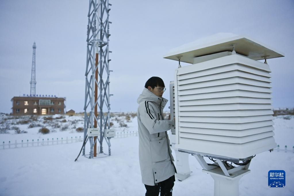 1月8日,阿克達拉國家大氣本底站觀測員謝翔在巡視地面觀測場儀器設備,清潔儀器和百葉箱。