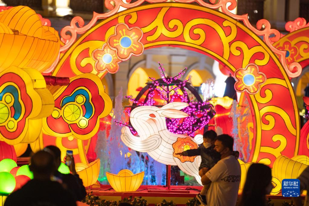 春節即將來臨,澳門市政署以“吉祥金兔賀新禧”為主題于澳門各區布置賀年燈飾,營造濃厚的節日氛圍。