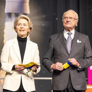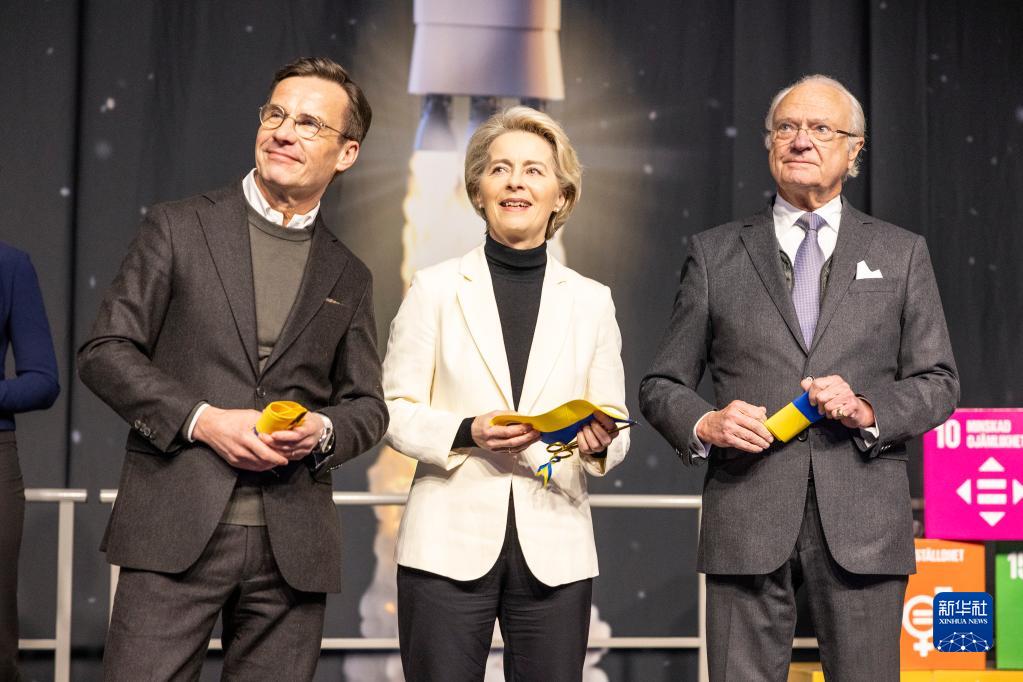1月13日,在瑞典北部城市基律納,瑞典國王卡爾十六世·古斯塔夫(右)、瑞典首相克里斯特松(左)與到訪的歐盟委員會主席馮德萊恩(中)出席航天港落成典禮并剪彩。