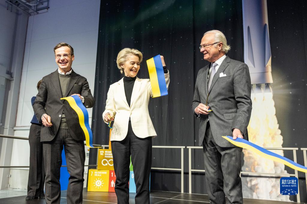 1月13日,在瑞典北部城市基律納,瑞典國王卡爾十六世·古斯塔夫(右)、瑞典首相克里斯特松(左)與到訪的歐盟委員會主席馮德萊恩(中)出席航天港落成典禮并剪彩。