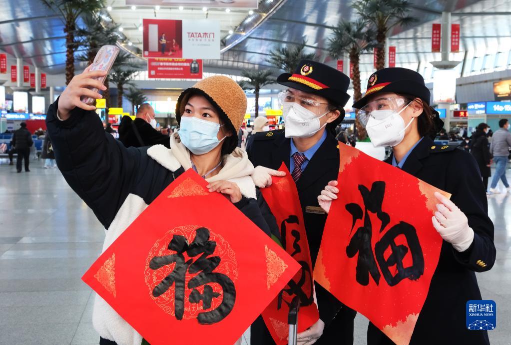 1月14日,在天津站候車大廳,乘車回家的旅客與車站工作人員用手機拍照留念。