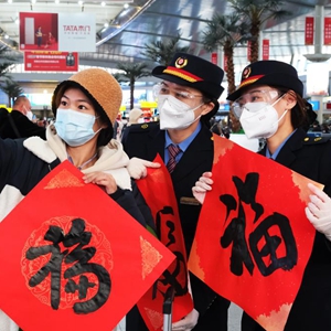當日正值北方小年,一場“送萬福、進萬家”書法公益活動在天津站候車大廳舉行。多名書法家現場書寫福字和春聯,由車站工作人員送給旅客,送上濃濃的祝福。新華社發(楊寶森 攝)