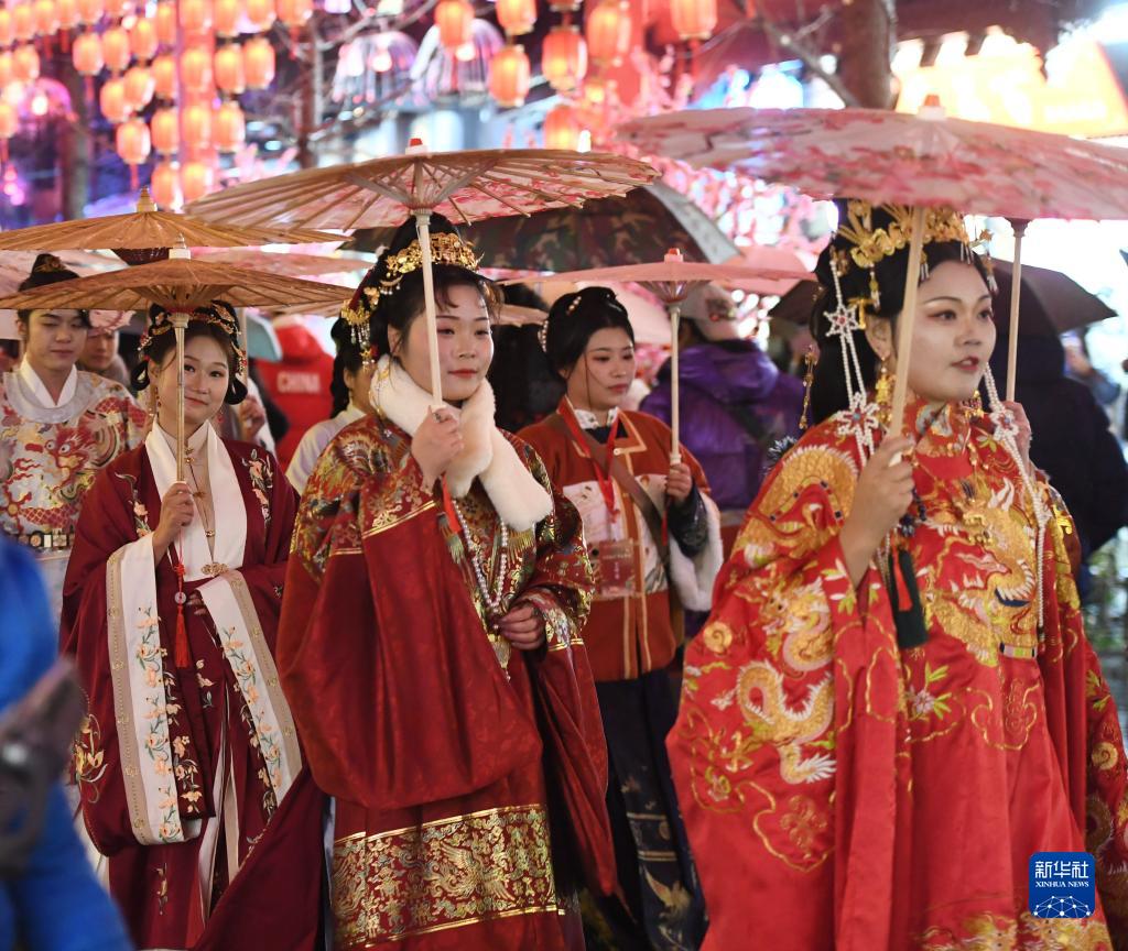 1月14日,演員在南京夫子廟景區亮燈儀式上表演漢服秀。